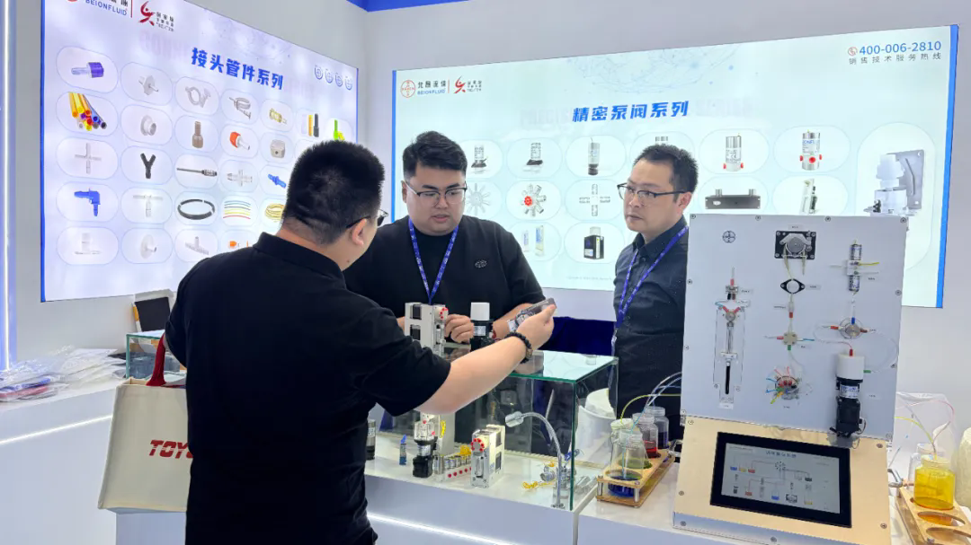 凭借硬核的产品实力与前沿的技术创新,北昂流体展位现场人气持续火爆,吸引了大批医疗设备制造商、行业专家及新老客户驻足洽谈、深度交流。销售工程师们以饱满的热情、深厚的专业素养,为客户一对一讲解产品性能与技术参数,共同探讨技术方案,每一次交流都充满了智慧的碰撞与合作的火花。